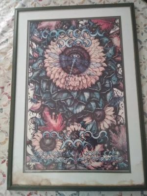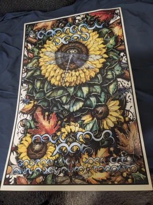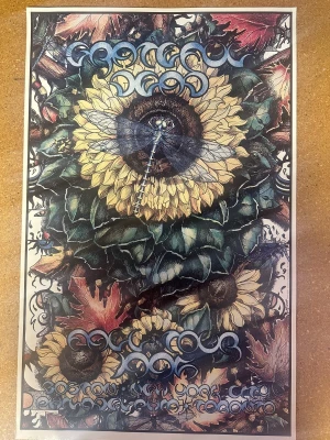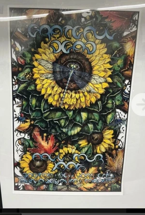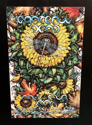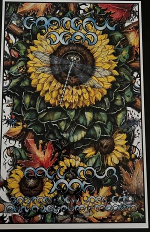 Grateful Dead 1995 Fall Tour poster featuring psychedelic sunflower and dragonfly artwork in vibrant yellows and greens with botanical elements. Created to promote the band's planned fall tour, this poster was sold through GD Almanac in late July 1995 but the tour was tragically cancelled following Jerry Garcia's death on August 9, 1995. Highly collectible as one of the final promotional materials for a tour that never happened, making it a poignant piece of Grateful Dead history.