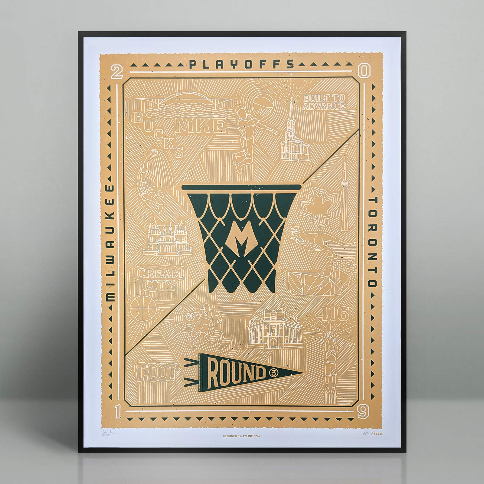 Commemorate the Bucks storming into the eastern conference finals with this limited edition, hand printed silk screened poster. This is the third poster in a series, we will release a new poster for each round of the playoffs that the Bucks compete in.
