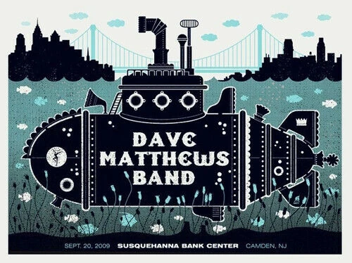 "The DMB sub is scoping out the Delaware River, looking for a place to re-surface for the show at Susquehanna Bank Center. Designed, signed and numbered by Methane Studios. Limited edition silk screened poster."