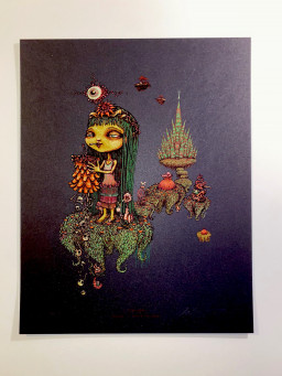 This darkly whimsical illustration features a central figure with an otherworldly appearance - a green-skinned character with long straight hair and a melancholic expression. They appear to be standing on a floating mossy island or landmass, wearing a dress with fringe-like details. An eye-like orb with radiating spikes floats above their head like a bizarre halo or crown. In the background, there's an ornate castle or tower structure with a golden, tiered design. Small figures that appear to be gnomes or mystical creatures populate the scene, creating a sense of scale and adding to the supernatural atmosphere. The color palette consists of deep purples, mossy greens, and golden hues against a dark background, giving the piece a mysterious, nocturnal quality. The artist's signature stippled texture and detailed linework create a rich, textured appearance throughout the composition.