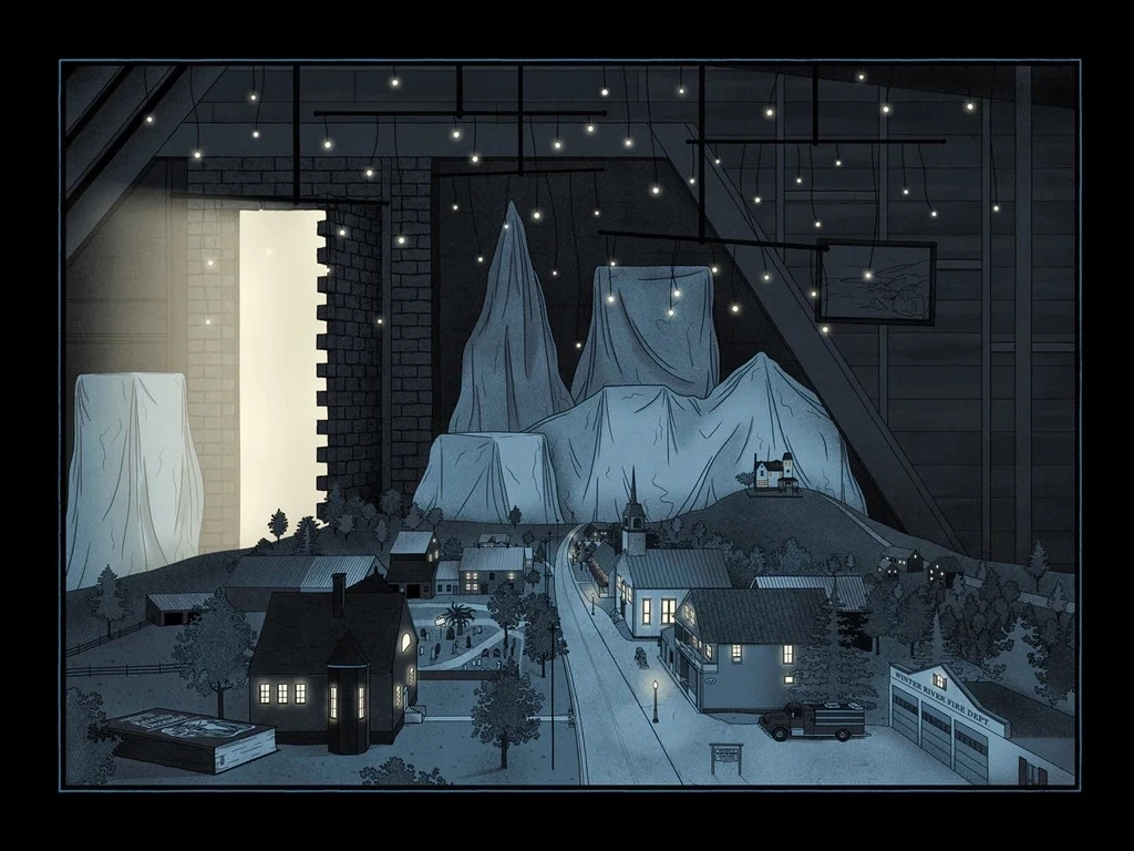 "This piece was created for an art exhibit called '30 Years Later' at Gallery 1988 in Los Angeles. The theme of the show was movies released in 1988, and I chose Beetlejuice. The lit up model town in the attic was something that had always stuck in my head, so it was awesome to finally pay homage to that." - NM