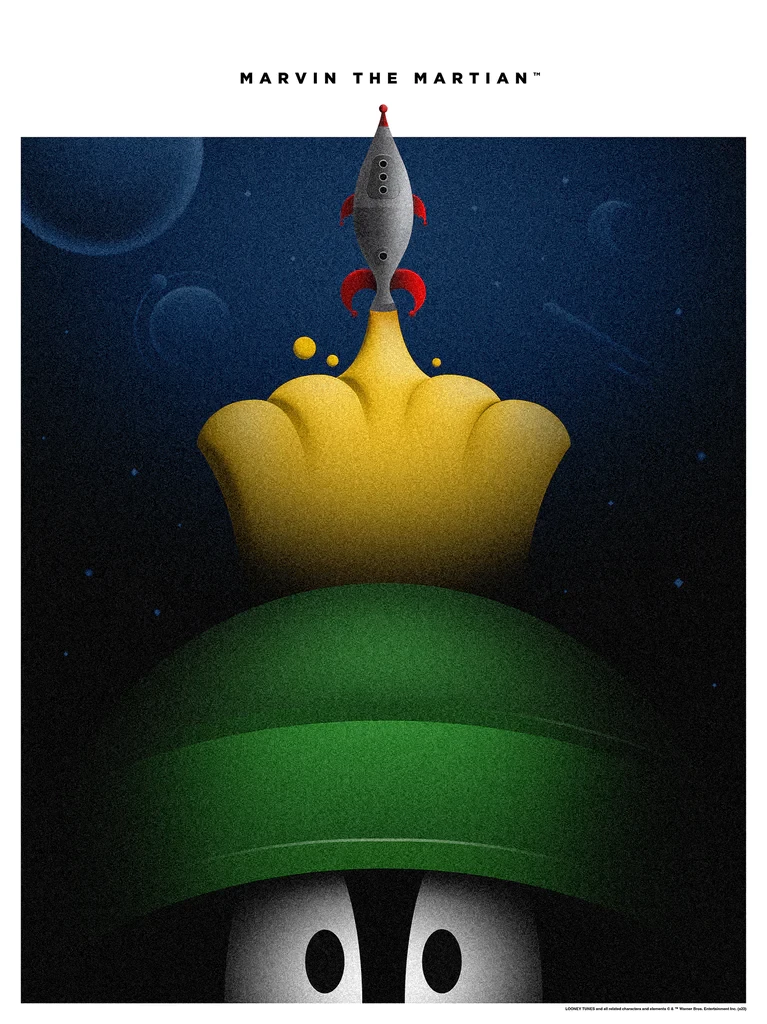 Michael’s print for the one and only Marvin the Martian offers a very clever and minimalistic approach to one of the top Toons. Michael’s art is always so bold and playful and creative, and we’re always stoked to work with creators who have a deep love for classic cartoons and animation.