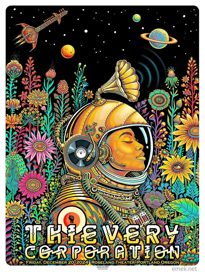 This is a stunning psychedelic concert poster by artist EMEK for Thievery Corporation, advertising a show at the Roseland Theater in Portland, Oregon on Friday, December 20, 2024.