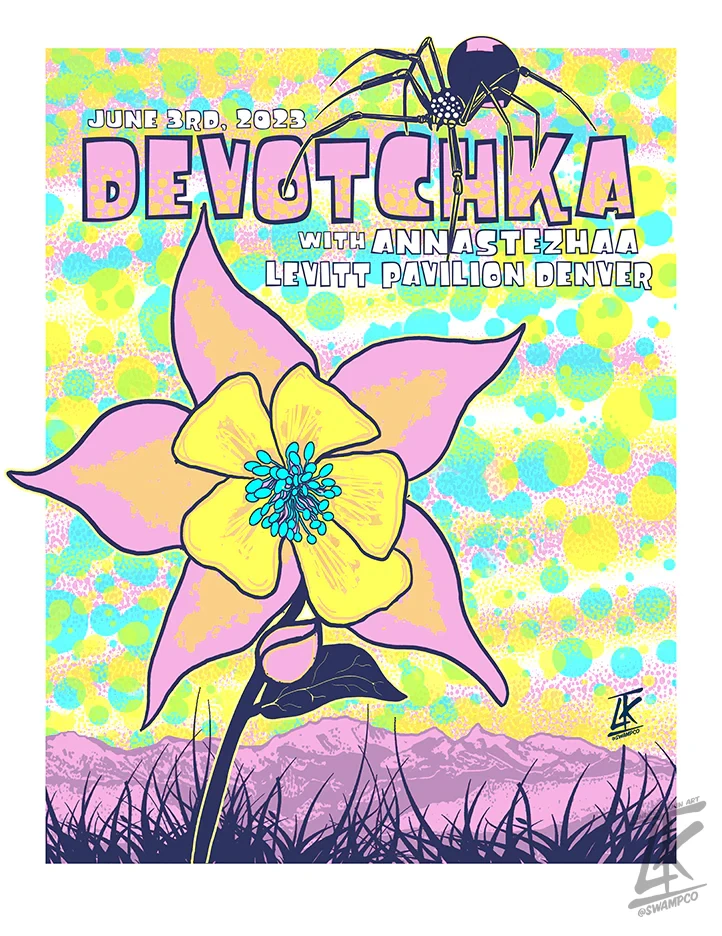 Experience the magic of Devotchka with this silk-screened poster from Lindsey Kuhn for their performance at Levitt Pavilion! LxKuhn art comes to life with the imagery of Colorado Columbine's glorious return during the early hours of a beautiful morning in the Rockies. Enjoy the good vibes and prepare to be awestruck with this poster on your wall!!