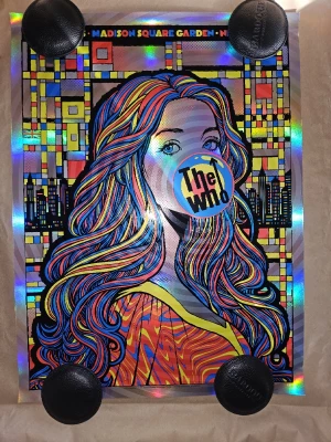 It was honor to be asked by Collectionzz and The Who to create the art for the band's final performance in New York City. My favorite memory of the city is walking through MOMA and finally seeing all the artist's work I'd read about in person. My art is an amalgam of some of my favorite pop artists. The portrait of the girl is meant to resemble a Roy Lichtenstein, the background pays homage to Piet Mondrian and the bubble itself is a nod to Jasper John's target paintings. I also added a clear varnish layer emanating from the bubble that radiates these hypnotic swirls that change depending on what light source you stand under.
