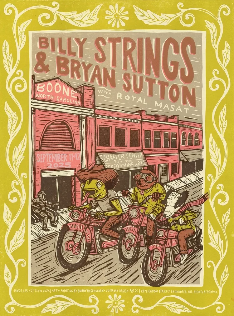 Official woodcut poster for Billy Strings, Bryan Sutton and Royal Masat shows in Boone, NC on September 11 & 12. Limited artist edition of 50 prints, comes signed and numbered. Printed from five hand-carved woodblocks.