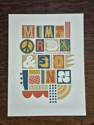 This 4-color 18”x24” letterpress poster celebrates Mumford & Sons show on July 27th in Charleston! The poster was printed in letterpress, using laser cut blocks. The poster utilizes some super unique antique and contemporary typography, alongside some other fun abstract elements to create a type-centric & bold design. These were printed on recycled cover weight French Paper Co. paper—The textures and imperfections and surface quality are something you can really only appreciate when you see the real thing!