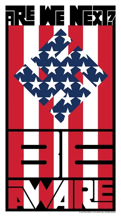 Wilson originally paired his image of the American flag overlaid with a swastika with the words Be Aware. At the suggestion of a pressman, he added the phrase Are We Next? — transforming the image into a pointed warning about blind nationalism and the direction of U.S. foreign policy.