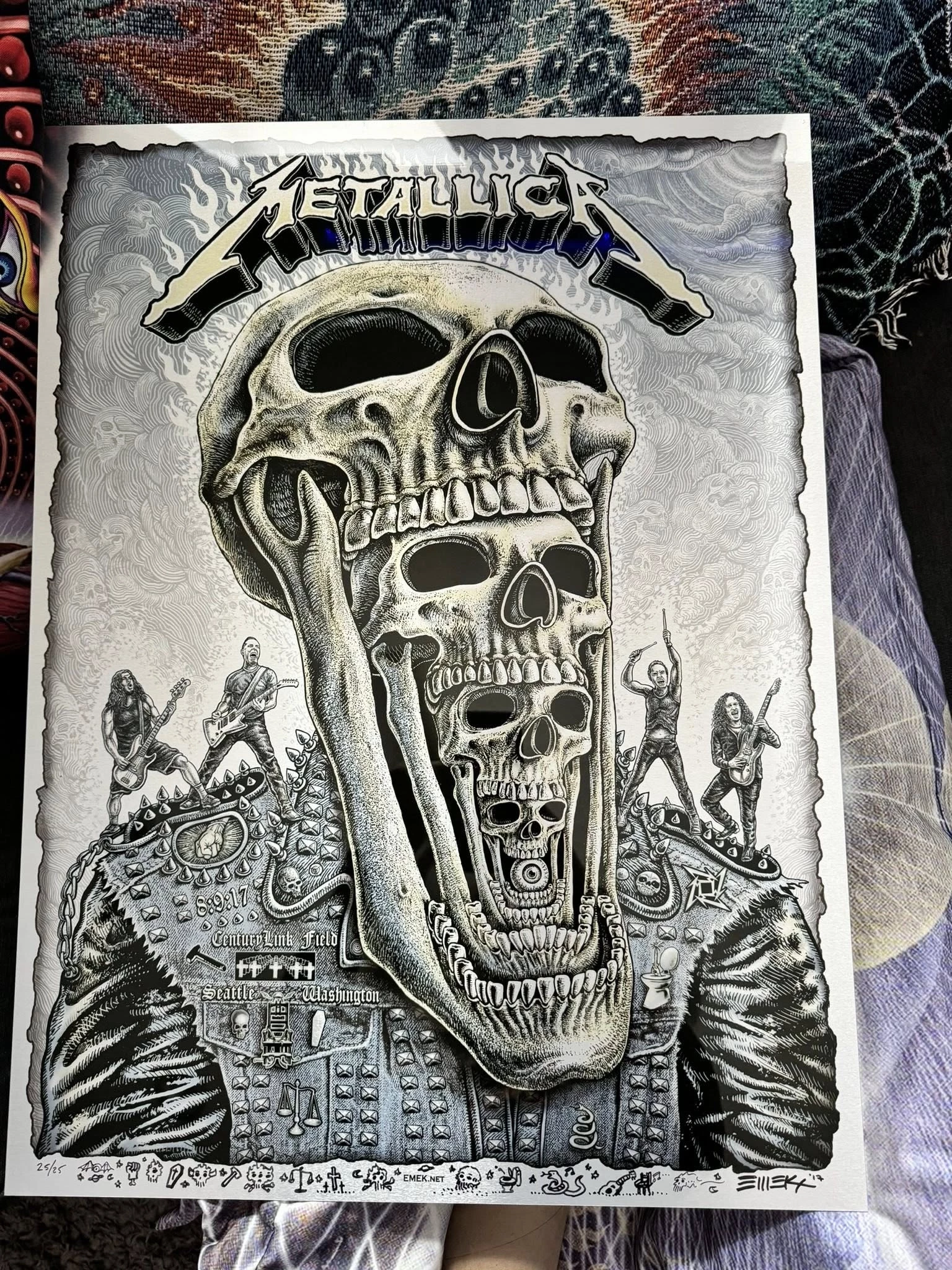 Back in high school, I always wanted to do a big, evil, wacky, old-skool flyer for Metallica. I finally got my chance... 4 band members on his shoulders like little demons whispering, and 4 skulls surround the one eye (which could be you the viewer, or the band’s singular vision for keeping the band rocking’ all of these 36 years.) On the monster’s old-skool denim and leather jacket are pins symbolizing their albums and tours over the years…