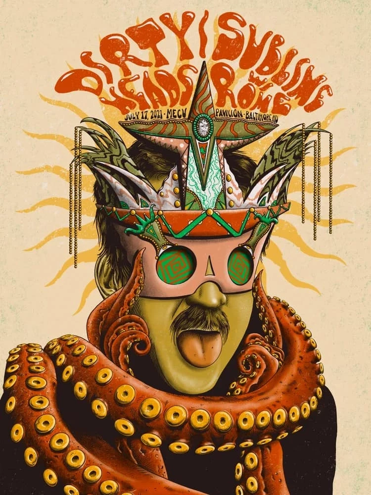 I was trying to come up with an idea for this poster while I was perusing Instagram and noticed this ridiculous picture of a good buddy of mine hanging with his family. In the photo they all had these homemade masks on. I asked him if he minded being the reference for my poster and he was stoked. I gave him tentacle arms to reference the dirty heads octopus and included a sun behind him to reference sublime, and then I amped everything up to make it even more insane.