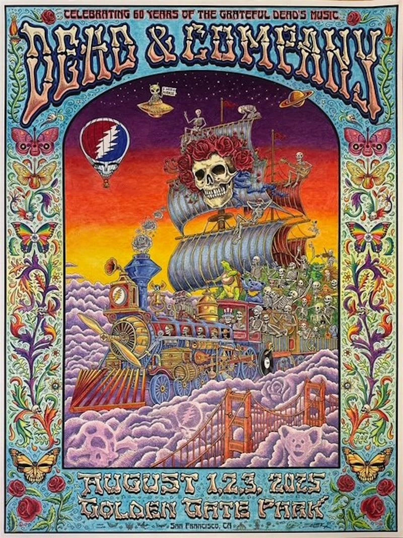 Commemorating the dates August 1, 2 & 3, 2025 at Golden Gate Park in San Francisco, this artwork serves as both a tribute to the Grateful Dead's enduring legacy and a celebration of their homecoming to where it all began.