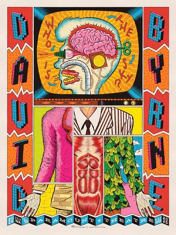 Credit to @yourcinema New work for David Byrne! This one is for his three night run in Seattle, happening right now. The art direction was to do something that referenced different eras of David’s career, and the first thing that came to mind were some of his iconic outfits (one of the first images of him that I remember seeing, other than music videos on MTV, was the shot of him in Rolling Stone by Annie Leibovitz, so I made sure to include that). I also took a lot of inspiration from the American Utopia stage show from his 2018 tour. That’s what gave birth to the idea of the tv set and medical poster as a layout. For the process nerds out there, I’ve included the Inspiration Board that I sent the band, the initial sketch and some close ups of my original inks. Everything was drawn with a non photo blue pencil, inked with a brush and microns and then digitally colored using tools from @truegrittexturesupply . Thanks to @carneymichael and the rest of the team at @redstarmerch for bringing me on board for this one.