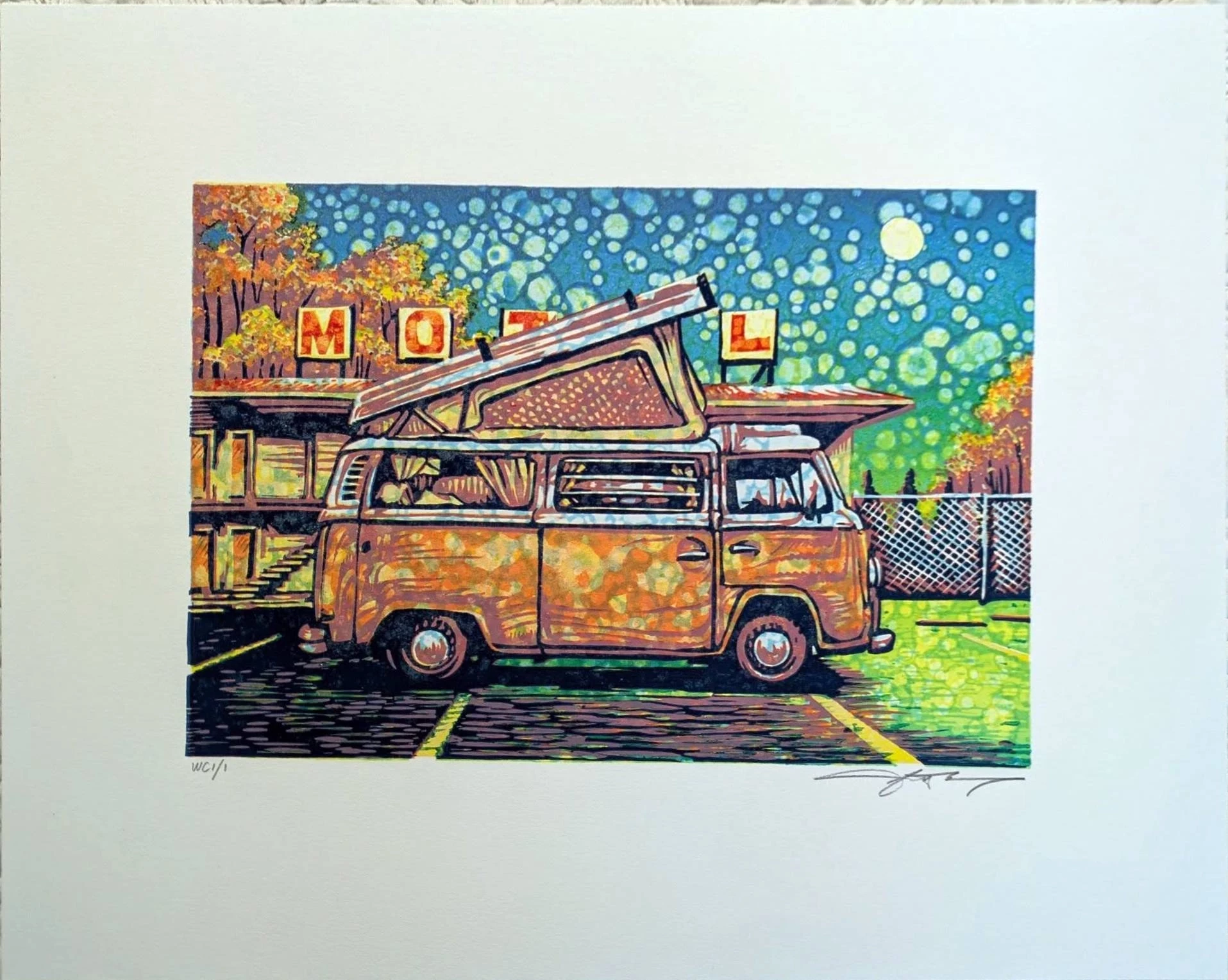Fall tour has always been my favorite. Crisp fall weather, warm wool sweaters and indoor shows, nothing beats it. This particular image came from my own experiences seeing the Grateful Dead in Fall of 1993 and crashing in a strangers pop up bus outside a random motel somewhere in the northeast. I’m guessing some of you might have had similar experiences, I certainly hope you did. 💀🌹⚡️🚌