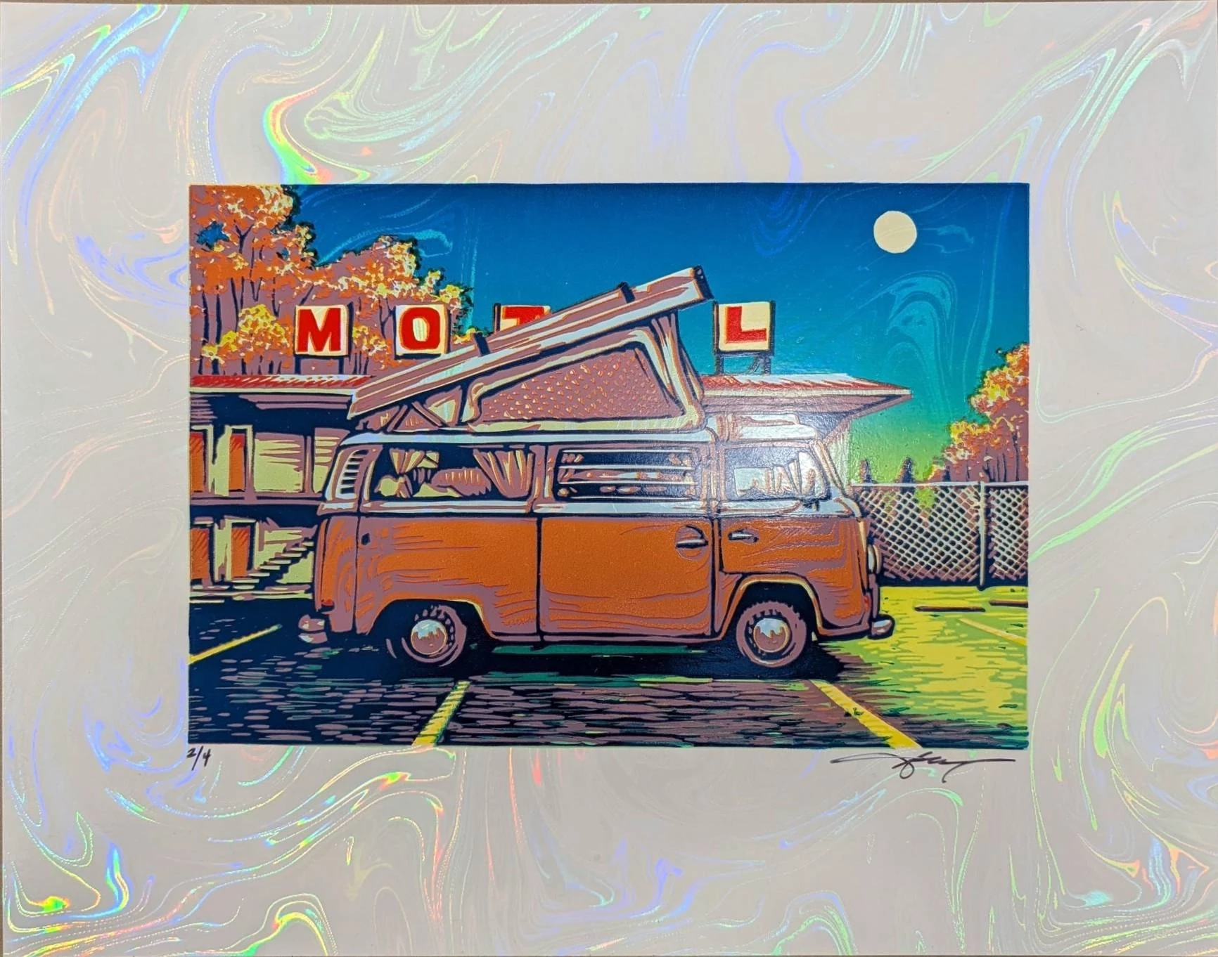 Fall tour has always been my favorite. Crisp fall weather, warm wool sweaters and indoor shows, nothing beats it. This particular image came from my own experiences seeing the Grateful Dead in Fall of 1993 and crashing in a strangers pop up bus outside a random motel somewhere in the northeast. I’m guessing some of you might have had similar experiences, I certainly hope you did. 💀🌹⚡️🚌