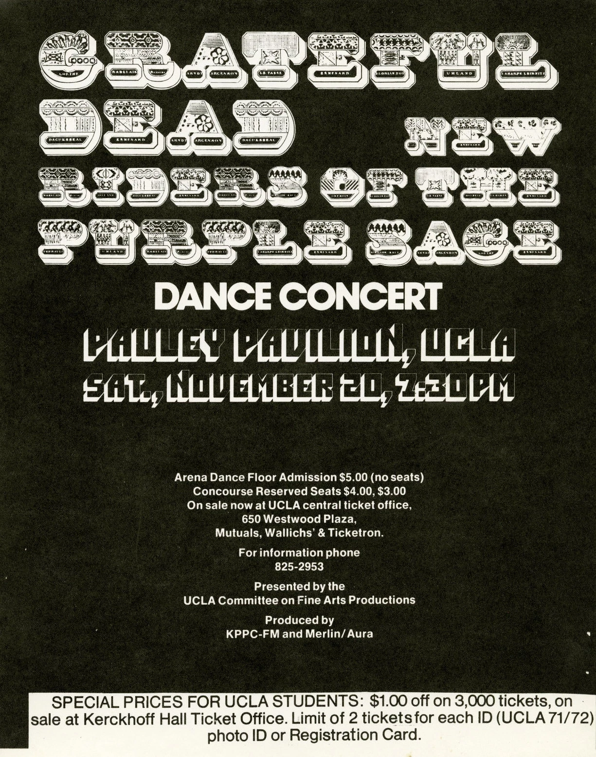 Newspaper advertisement for an FM broadcast on KMET, published in the Los Angeles paper The Staff on November 19, 1971. A similar version appeared in the Los Angeles Free Press, printed in green ink rather than the red used here. No poster is currently known for this broadcast.