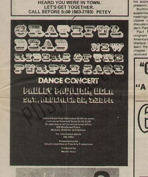 Original newspaper concert ad for Grateful Dead with the New Riders of the Purple Sage at the Pauley Pavilion at UCLA in 1971. Original ad, not a photocopy or reproduction.