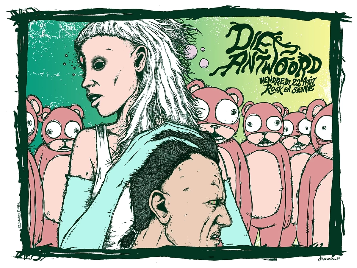 Approx. 30×23 inches, this 7-color screen print was created for Die Antwoord’s Rock en Seine performance in Paris. The artwork was widely used in promotional materials, including a large installation in the Duroc Metro station. Artist Jermaine describes the band simply: “Don’t overthink it—just feel it. And they’re down with Aphex Twin.”