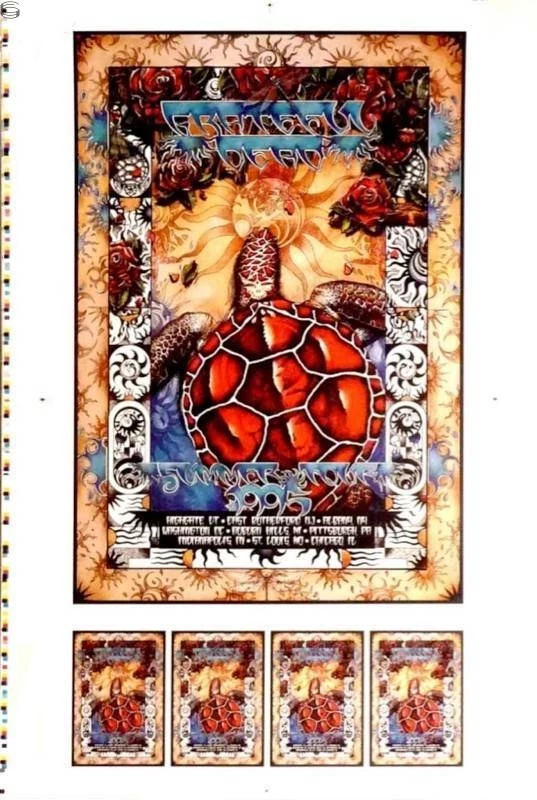 Official Grateful Dead Summer Tour Poster for 1995 — the tour that culminated in Jerry Garcia’s final performance. Artist Michael Everett’s original artwork incorporates numerous subtle Grateful Dead motifs woven throughout the design.