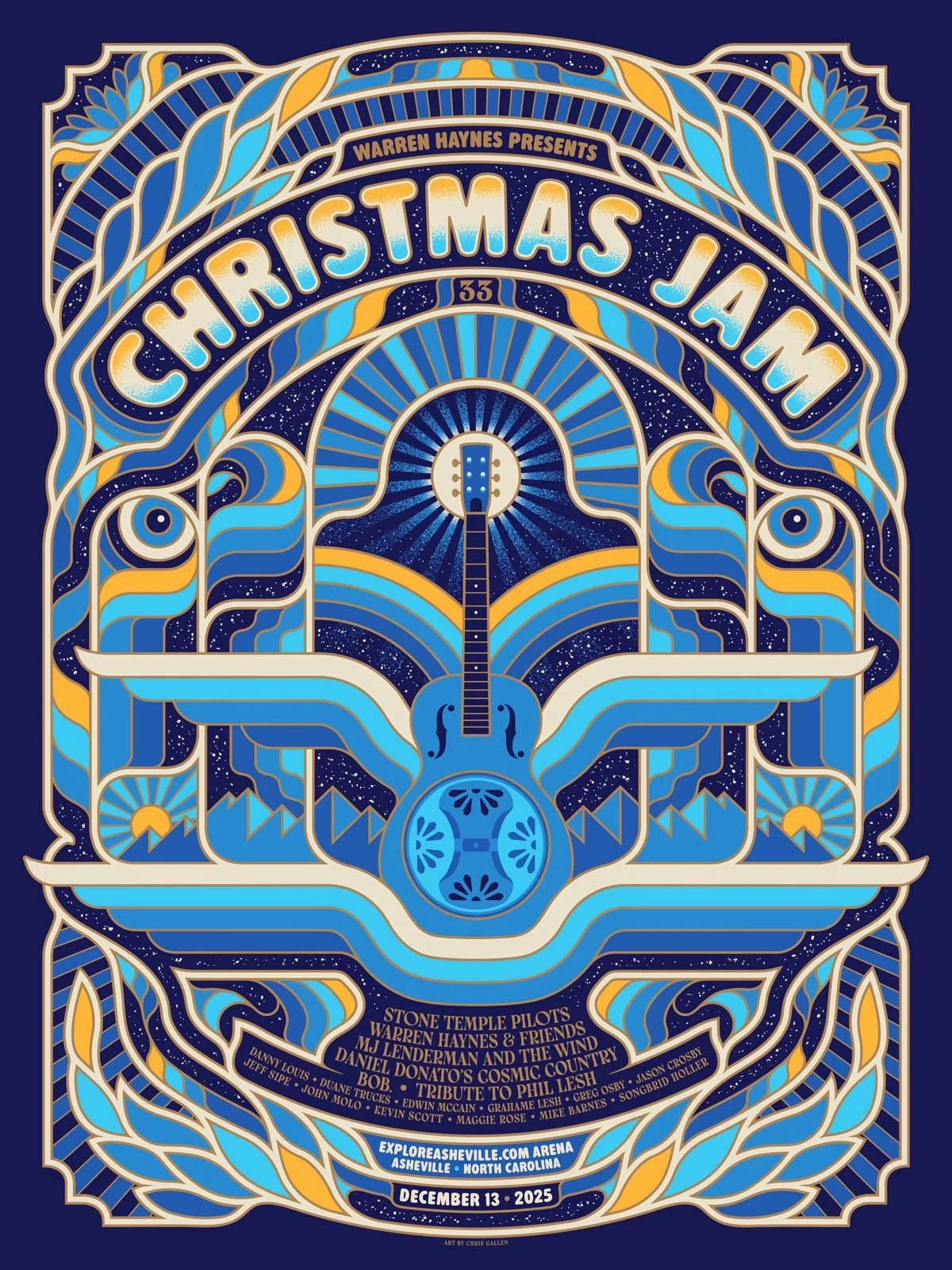 Feeling lucky being asked to make a poster for the legendary Warren Haynes Christmas Jam, put on by him since 1988! I had an especially fun time creating this, starting with my promo art for the event as a starting point. I just started building shapes and experimenting, piece by piece, and got in a nice groove that eventually pulled it together. This will be screenprinted with a Metallic Gold key-line, on Dark Blue paper.