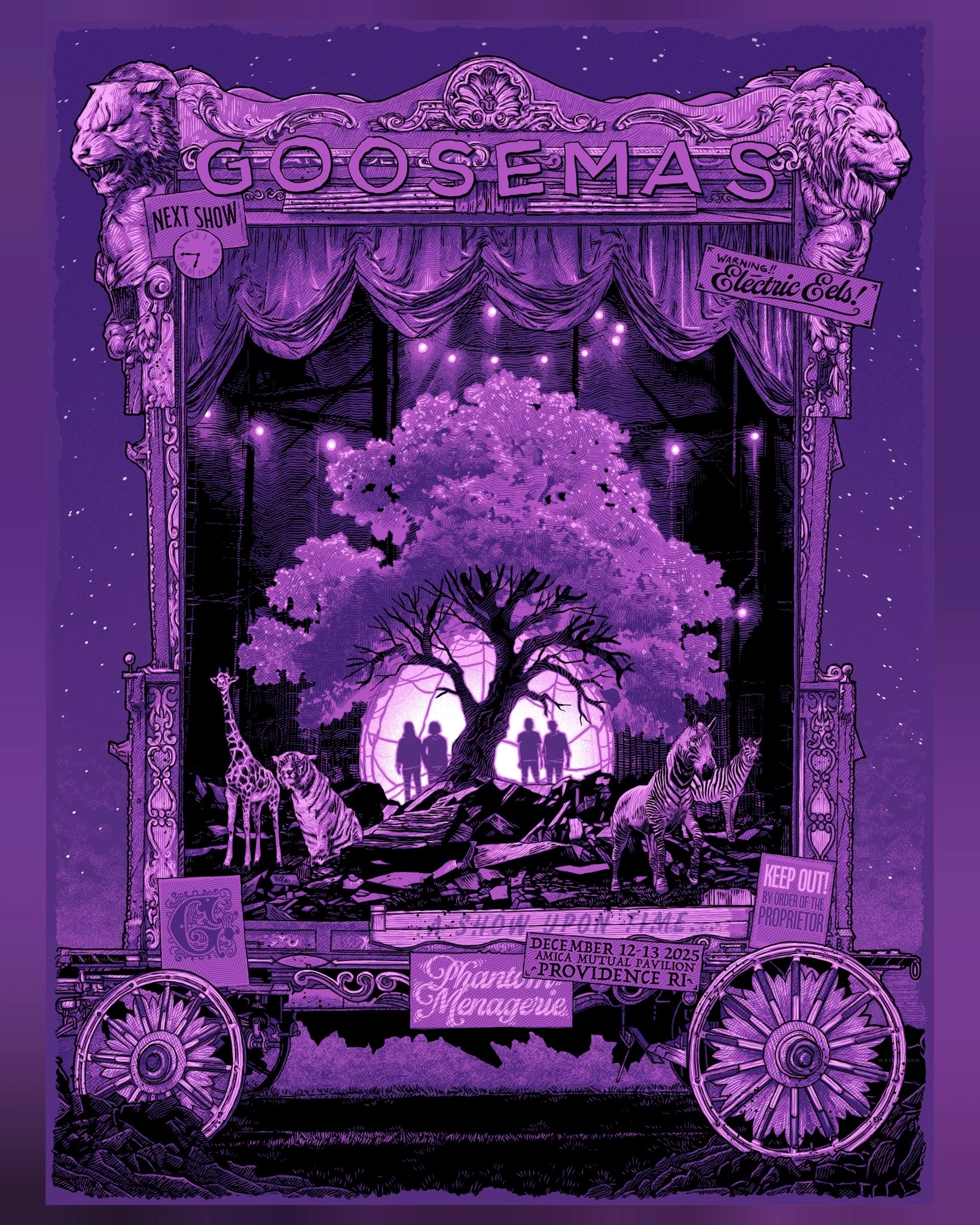 my print for GOOSEMAS tonight and tomorrow in Providence. just a magical arboretum menagerie that may or may not contain eels. purple paper and rainbow foil prints available at the shows and APs soon. xo