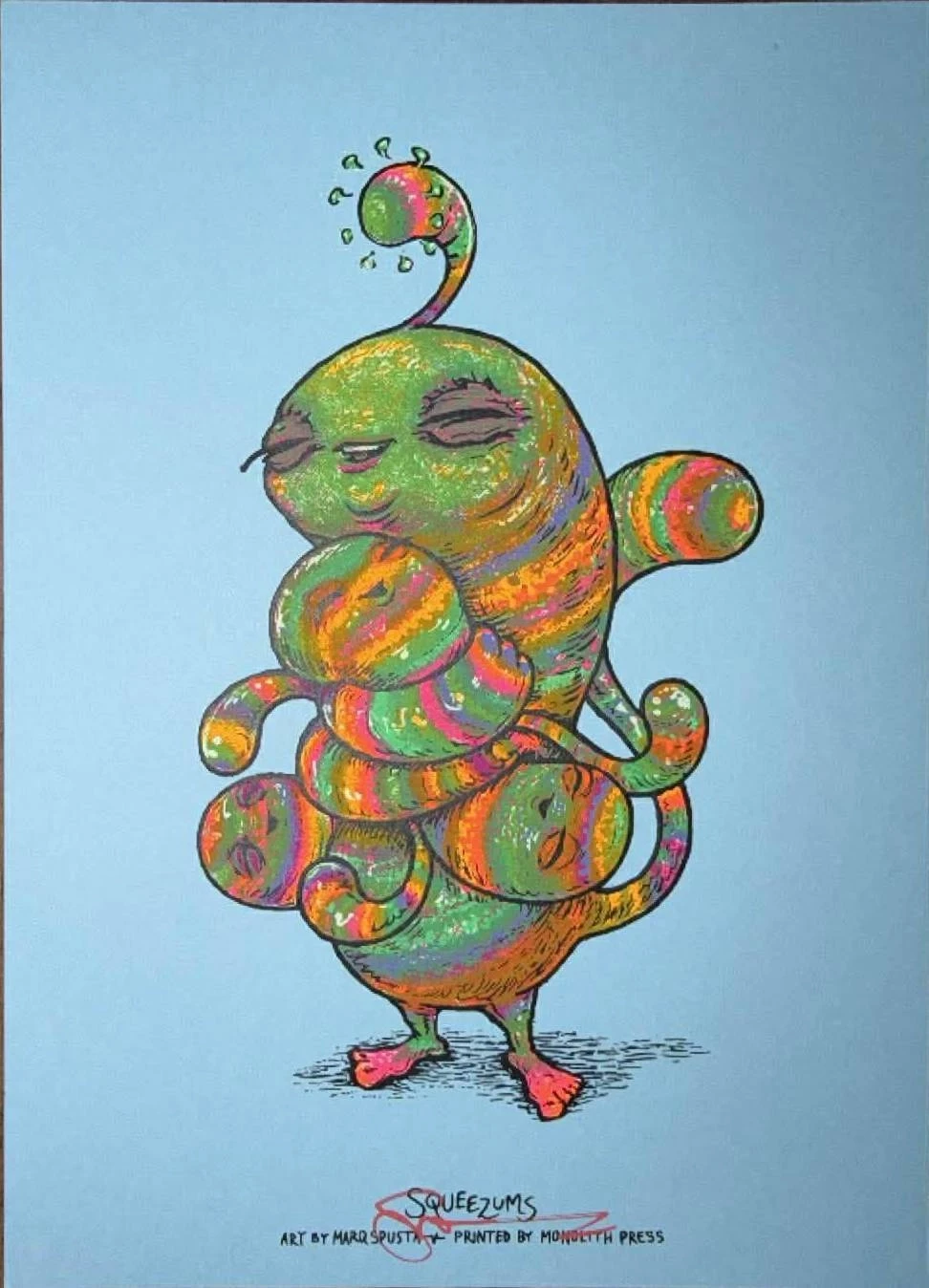 Packs will include random versions of the following; 1 x Squeezums 5″x7″, 1 x Soundly Spinning 5″x7″, 2 x mystery 7″x7″s, 1 x mystery 5″x5″ + 1 x micro print. (That’s 4 scribble signed prints plus a 5″x5″ and a micro). The Squeezums packs will be $130 + shipping.