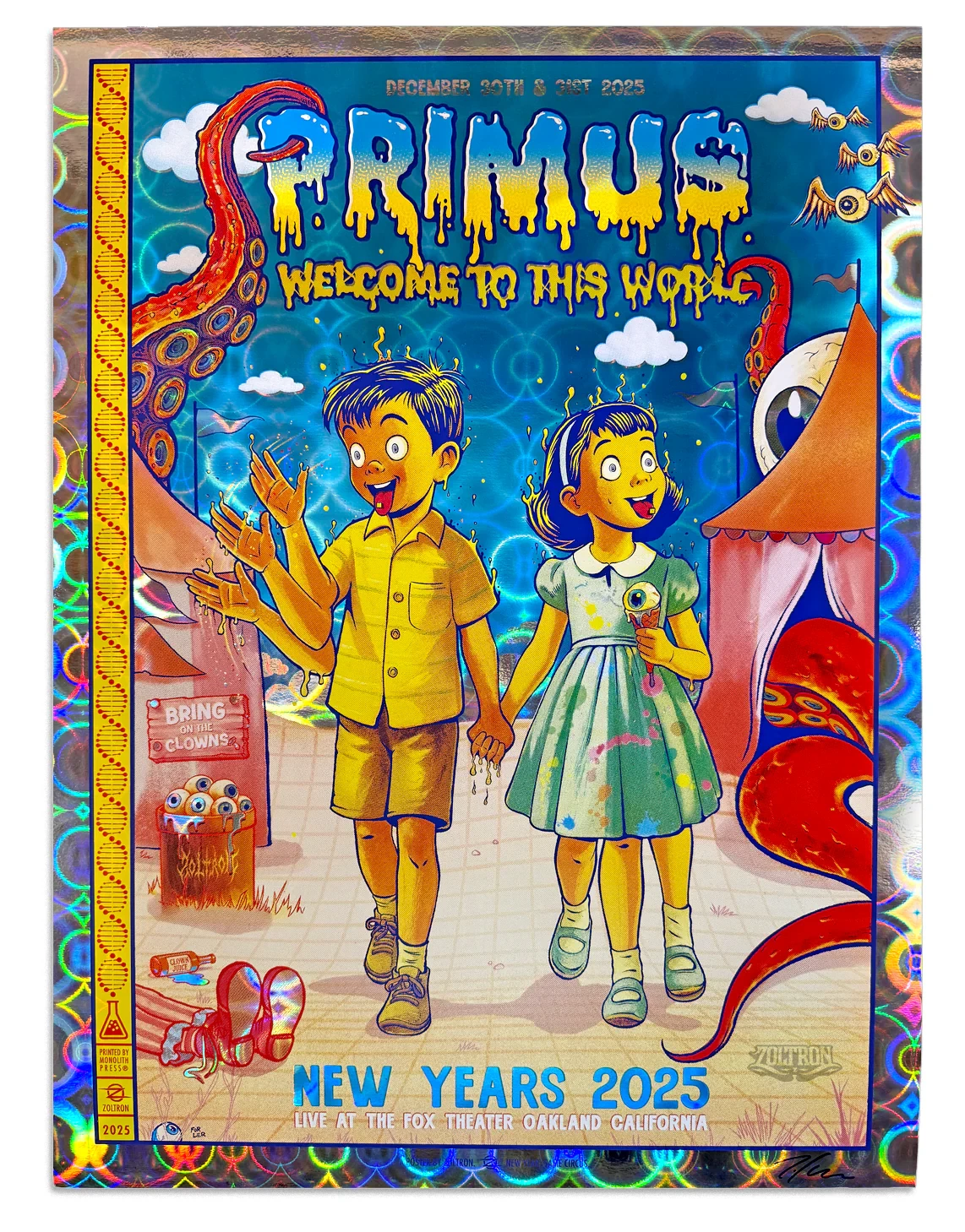 The Primus NYE poster for 12/30 & 12/31 at the Fox Theater in Oakland, CA continues that twisted children's book series. 600 artist-signed, 5-color serigraphs with metallic glaze background elements sold out at the show minutes after doors opened.