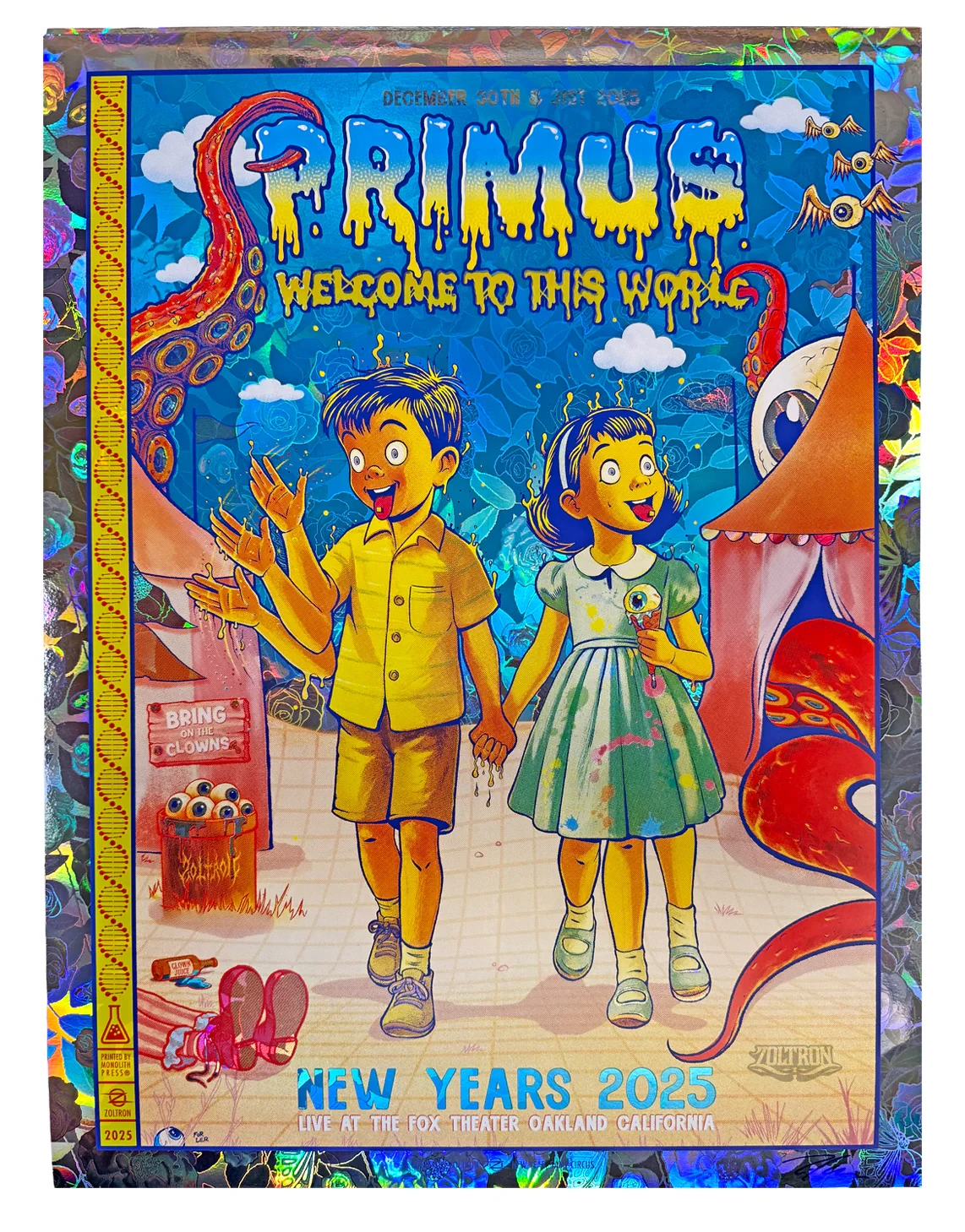 The Primus NYE poster for 12/30 & 12/31 at the Fox Theater in Oakland, CA continues that twisted children's book series. 600 artist-signed, 5-color serigraphs with metallic glaze background elements sold out at the show minutes after doors opened.