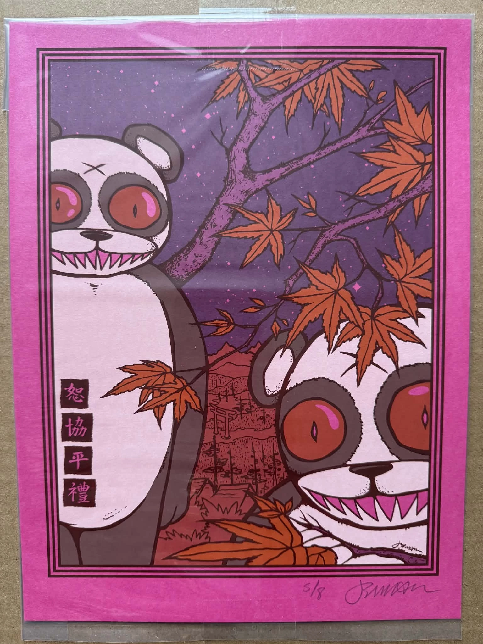 Part of Rogers’ ongoing Dero mythology, the figures are disguised as giant pandas—covert operatives working in plain sight. Along the side of the image are four Chinese characters—怒 (anger), 協 (cooperation), 平 (peace), 權 (power)—representing opposing forces and balance within the Dero world.
