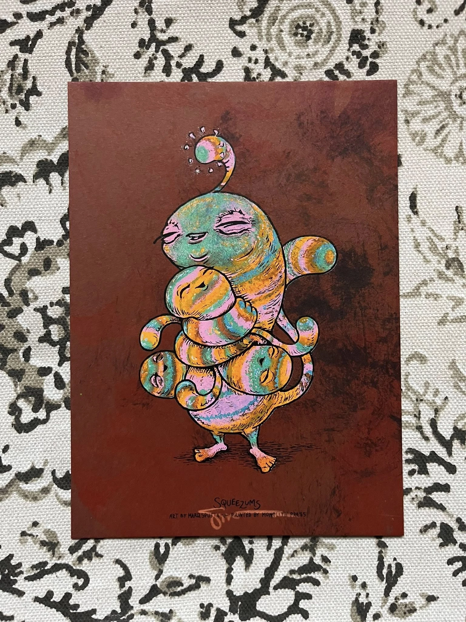 Packs will include random versions of the following; 1 x Squeezums 5″x7″, 1 x Soundly Spinning 5″x7″, 2 x mystery 7″x7″s, 1 x mystery 5″x5″ + 1 x micro print. (That’s 4 scribble signed prints plus a 5″x5″ and a micro). The Squeezums packs will be $130 + shipping.