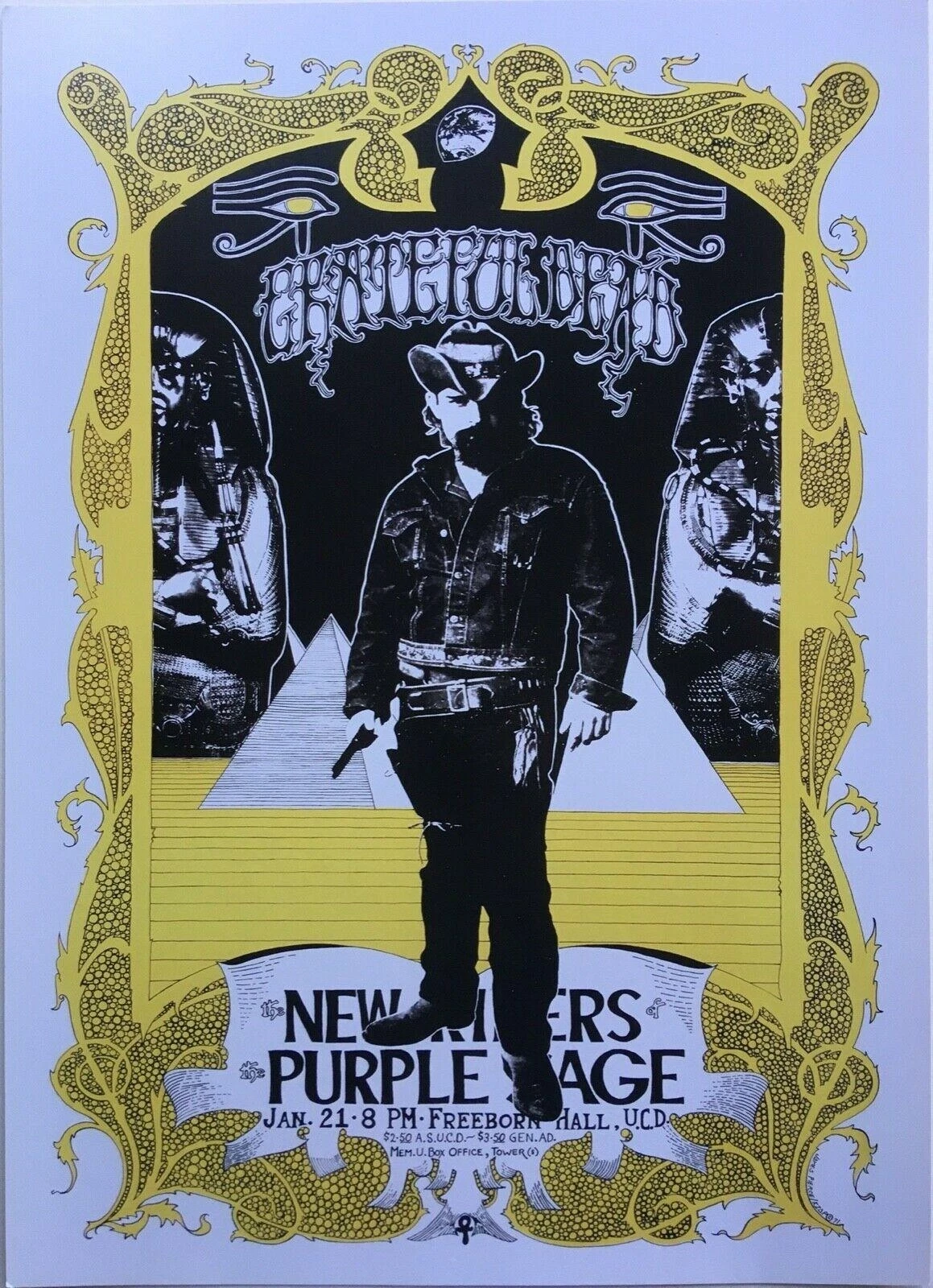 This was done by me originally in pencil on paper, and each section / photo / layer was placed on a clear acetate sheet, per the printer's instructions, which were overlaid for the final version. For the clean black lines, I used a crow quill pen and bottle of black ink (no computers or Photoshop back then). I also worked stage for the promoter, Direct Productions (same for my UC Davis 1971 Picnic Day poster, later in the year, also held at Freeborn Hall). From Portland, OR 12/29/2020.