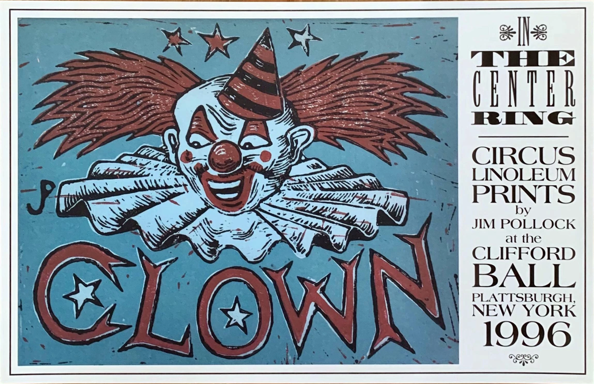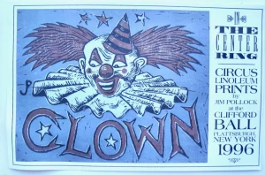 'In the Center Ring – Circus Linoleum Prints’ by Jim Pollock, created on-site at the Clifford Ball in Plattsburgh, New York, 1996, commemorates his ‘Big Top’ series. This poster, inspired by Pollock’s linoleum-block-printed Clown, was sold through Dry Goods for several years.