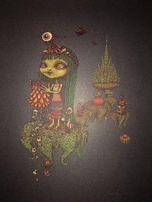 This darkly whimsical illustration features a central figure with an otherworldly appearance - a green-skinned character with long straight hair and a melancholic expression. They appear to be standing on a floating mossy island or landmass, wearing a dress with fringe-like details. An eye-like orb with radiating spikes floats above their head like a bizarre halo or crown. In the background, there's an ornate castle or tower structure with a golden, tiered design. Small figures that appear to be gnomes or mystical creatures populate the scene, creating a sense of scale and adding to the supernatural atmosphere. The color palette consists of deep purples, mossy greens, and golden hues against a dark background, giving the piece a mysterious, nocturnal quality. The artist's signature stippled texture and detailed linework create a rich, textured appearance throughout the composition.