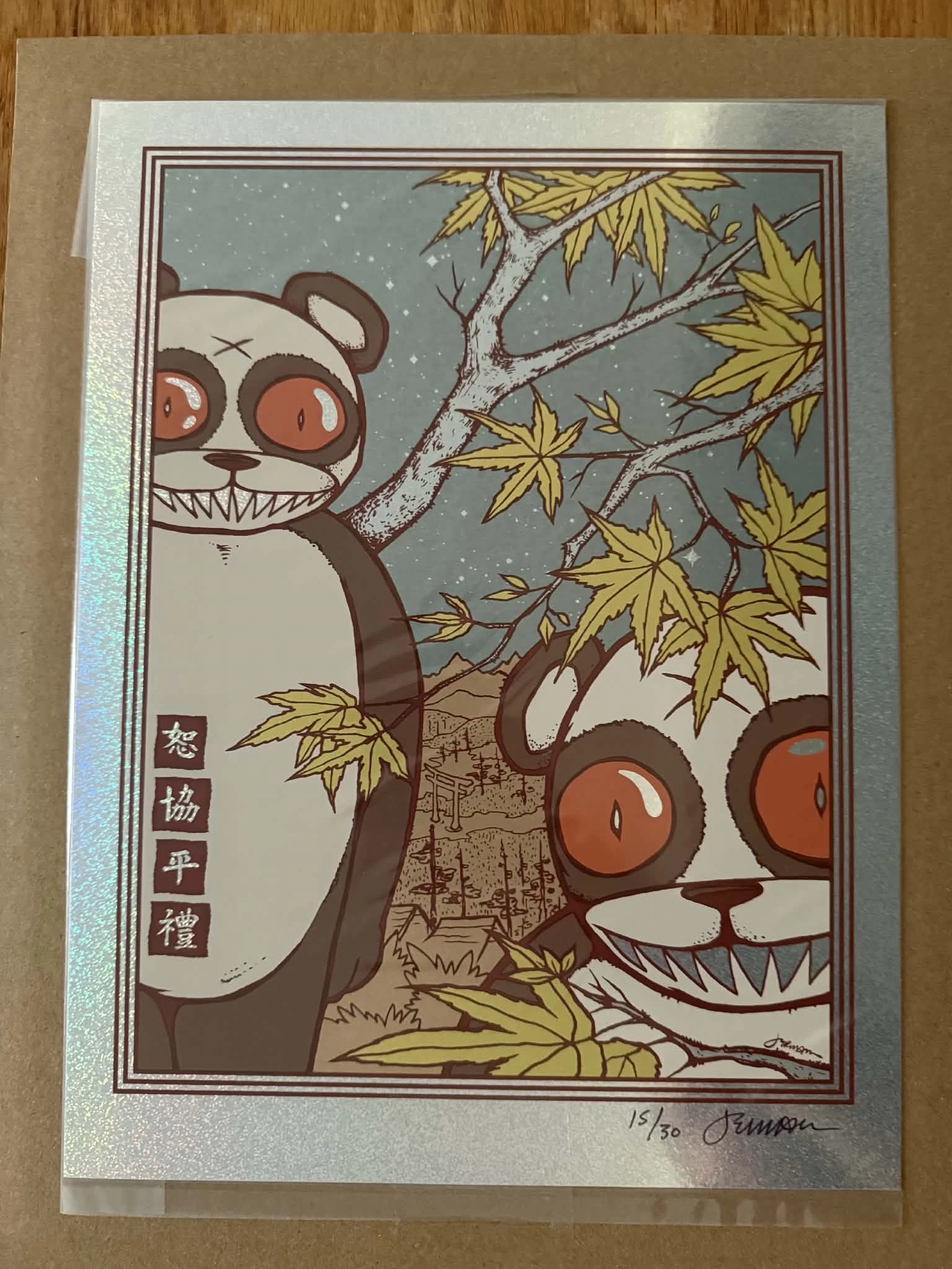 Part of Rogers’ ongoing Dero mythology, the figures are disguised as giant pandas—covert operatives working in plain sight. Along the side of the image are four Chinese characters—怒 (anger), 協 (cooperation), 平 (peace), 權 (power)—representing opposing forces and balance within the Dero world.