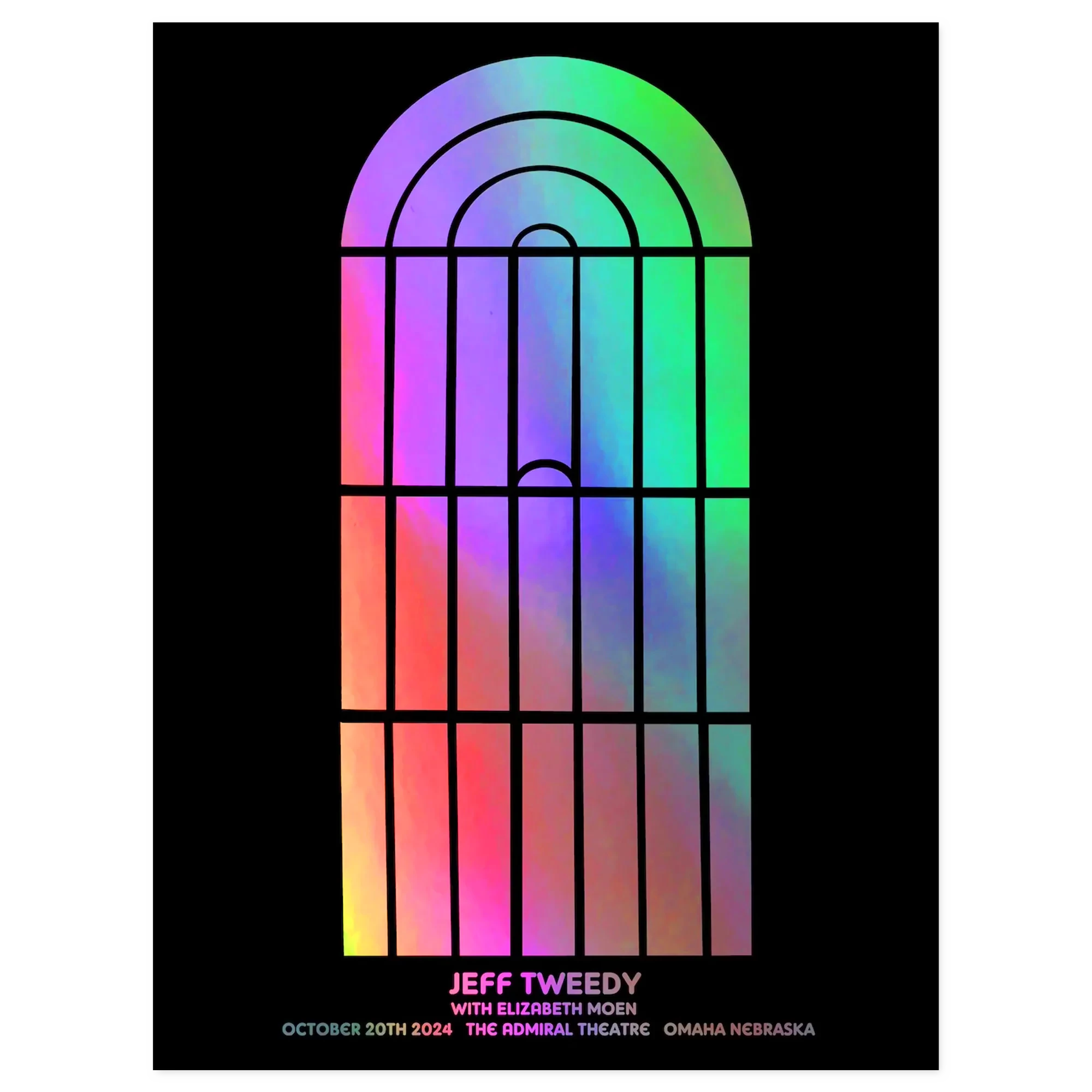 Limited edition Holographic (total of 65) screen print commemorating Jeff Tweedy's solo shows in Omaha, NE at The Admiral on October 20, 2024. The design features the venue's iconic front windows on holographic metallic paper.