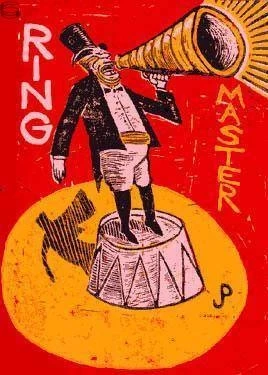 Originally sold through Jim's website in 2000 for $50 plus shipping, these 3-color linoleum block prints from the Big Top Series were sometimes signed on the back.