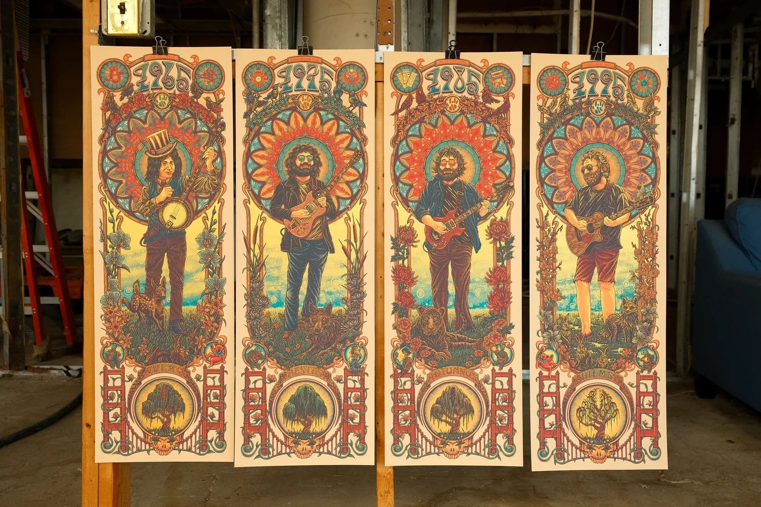 Four prints, 12x36 each, seven colors, a rainbow full of sound straight to your noggin. It has been a long and testing six months working on this quartet, and I could not be more grateful to finally have this out in the world. Group reserve is on sale now at the link below, password is "GD". Public onsale will be tomorrow at noon. Please do not share this outside of the group until it is publicly shared tomorrow.