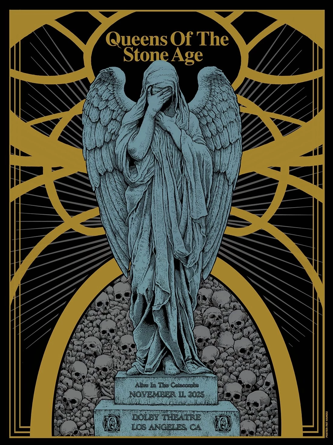 As QOTSA likes to say : Los Angeles your time to dance! Pleased to present my poster for tonight's Queens Of The Stone Age homecoming show for their Alive In The Catacombs tour at @dolbytheatre. Thematically and visually right in my sweet spot when it comes to creating posters- the background design motif on this one is based on the ornate ceiling design of the Dolby Theatre. Regular editions with metallic gold and gold foil editions will be available at the show while they last.