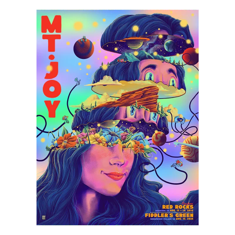 2026 marks 10 years of MJ, 8 of which I will have (and am) been so lucky to be even just a tiny part in, so the 2026 edition of Mt. Joy in Colorado is gearing up to be that of celebration and warm fuzzy memories to be made still. I wanted to make something that encapsulated that in a way - really trying to capture the feeling and emotion that popped up in someone’s brain while at the show on that summer night in August next year, helped along by the lil squiggly arms that help bring all of the magic together while sitting on those steps and listening to the band rip away. Then moving on up to a night under the stars with the mountains in view, representing the night at fiddlers to cap off a fantastic weekend in Colorado filled with joy, comfort, stars, and memories for another 10 years to come.