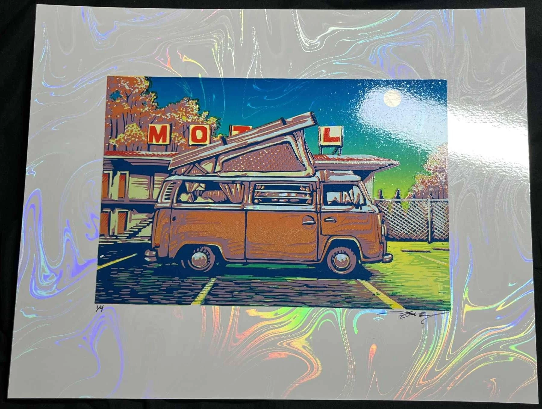 Fall tour has always been my favorite. Crisp fall weather, warm wool sweaters and indoor shows, nothing beats it. This particular image came from my own experiences seeing the Grateful Dead in Fall of 1993 and crashing in a strangers pop up bus outside a random motel somewhere in the northeast. I’m guessing some of you might have had similar experiences, I certainly hope you did. 💀🌹⚡️🚌