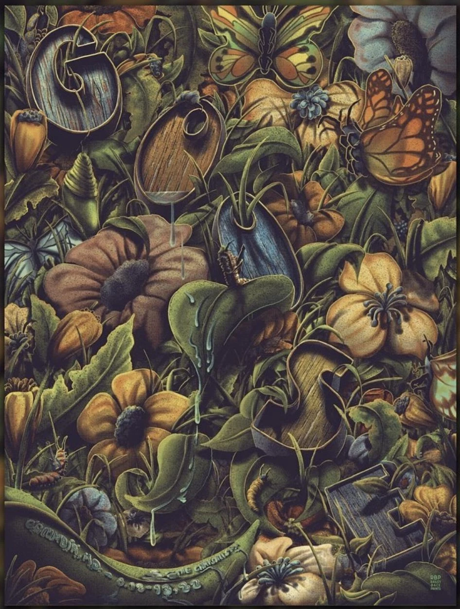 The band is playing my old stomping grounds, so I wanted to do something special - and when I heard they were playing the chrysalis, the concept was a no brainer. I haven’t gotten to really dive into a heavy botanical themed poster in a bit, so the ability to do just that while illustrating musical critters and butterflies (with hats???) was the BEST. Plus, I got to stare at a ton of images of water droplets to nail that show info, which was also a blast.