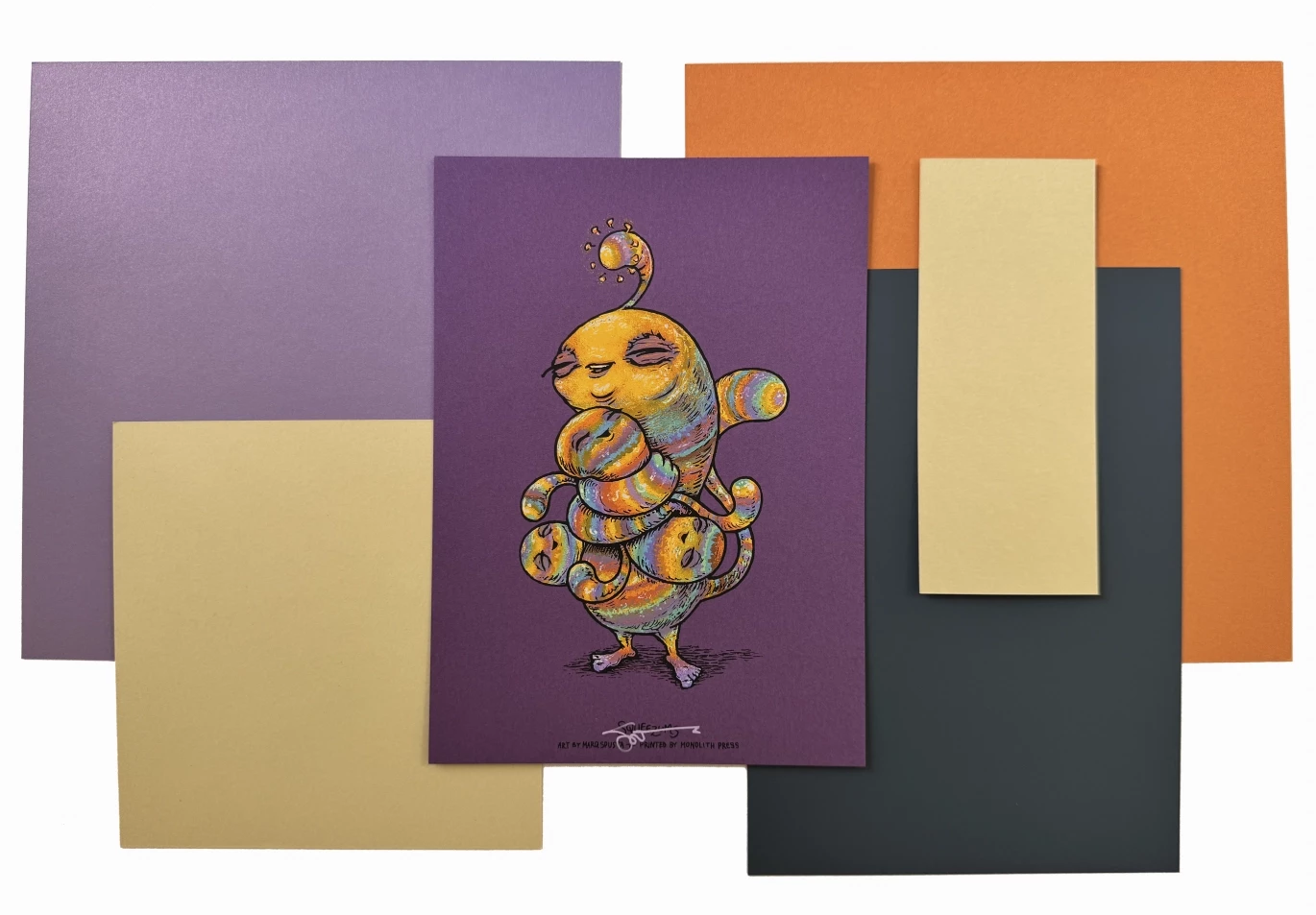 Packs will include random versions of the following; 1 x Squeezums 5″x7″, 1 x Soundly Spinning 5″x7″, 2 x mystery 7″x7″s, 1 x mystery 5″x5″ + 1 x micro print. (That’s 4 scribble signed prints plus a 5″x5″ and a micro). The Squeezums packs will be $130 + shipping.