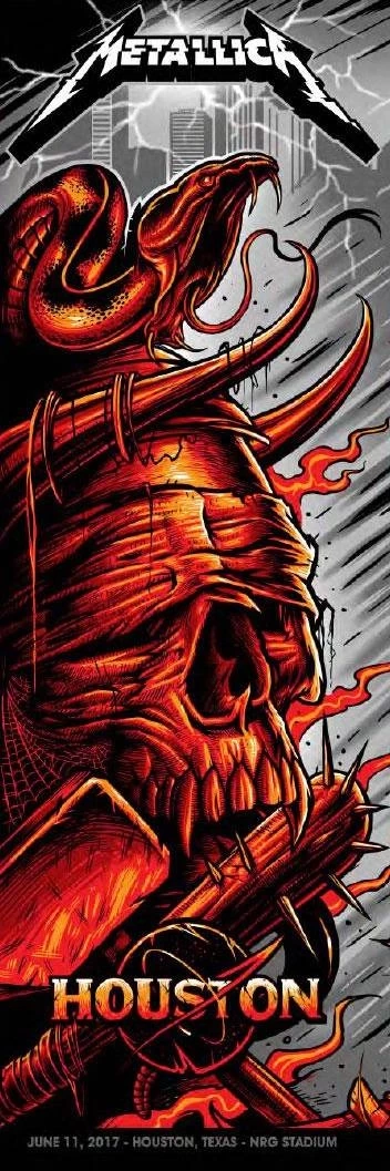 The artwork in this poster incorporates the bands first 5 albums as well as a few nods to the great state of Texas. The hammer is from the Kill Em All album, and the club with the spikes is referenced from the old Damage Inc graphic (which is from the Master of Puppets album). I added a little lightning in the background to tie in the Ride the Lightning album. The blind fold represents the ...And Justice For All album, and the snake is from the Black Album. I drew a rattle snake to reference Texas as well as adding the bull horns and Houston/Nasa logo as a nod to the Space Center located within the state.
