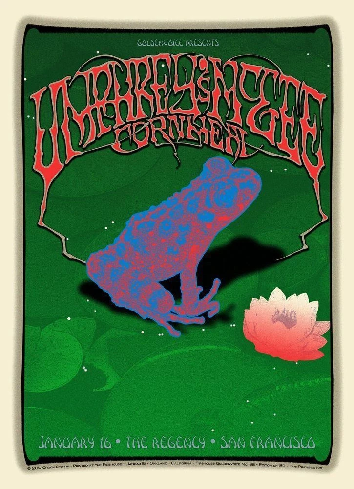 I went for maximum Eye-Fry using an ultra powerful fluorescent red: I hand-mixed the red ink with extra flo’ powder, so the frog just leaps off the poster.